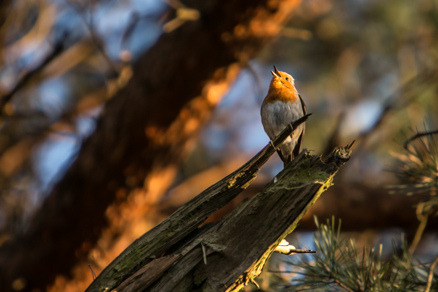 I photographed this singing robin while out walking in the surroundings of Bussum. I had some time to take several shots; the bird didn’t fly off until after a few minutes. It was the golden hour, the time when I go out cycling or running or walking. The sun color against the tree branch matches nicely with the bird’s color.