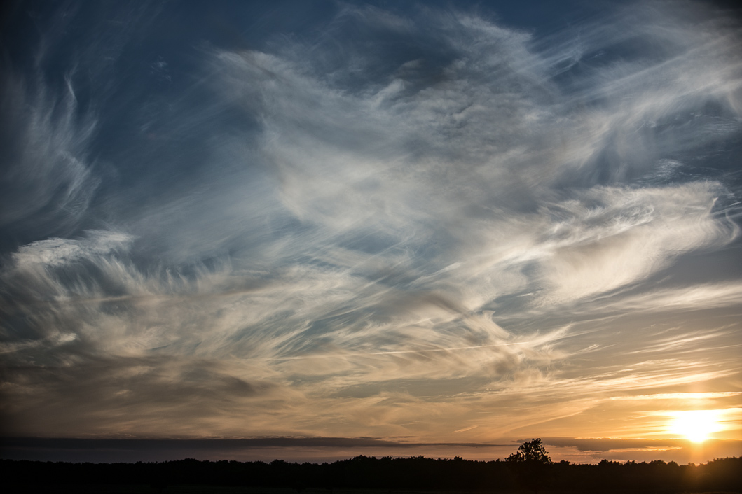 Yesterday I went biking along the heath, which is quite close to home. Of course this has to be done around the golden hour, to get soft directional sunlight. There were some deer, two very large mushrooms, very out of place in mid-Summer and these nice layers of clouds. They look like wings, but admittedly my fantasy is sometimes a bit enthusiastic. 😉